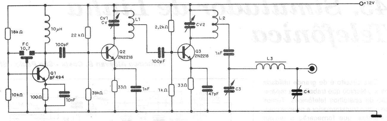 We found this small shortwave transmitter circuit in a 1994 documentation. The frequency of the circuit is determined by a 10.7 MHz ceramic filter. The L1 coil consists of 15 wire 28 in a 0.5 cm diameter plastic tube without a core and L2 is equal to L1. L3 has 15 turns of wire 28 in a 0.8 cm diameter core with a ferrite core.