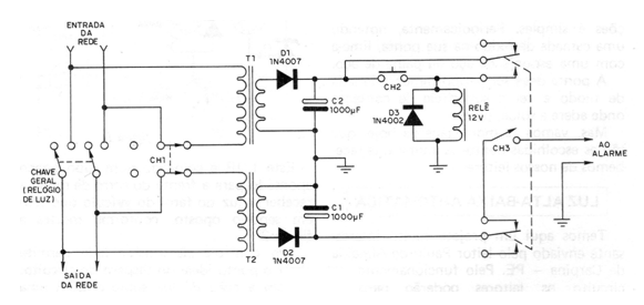 The author of this project, found in a 1982 documentation, says that we in electronics are smart, but today's thieves are much smarter than we might think. And it was with this in mind that the author “came up” with a big surprise for thieves who try to eventually disarm the security system of a residence, turning off their general key. In the figure we have the circuit of the system in question. Two transformers are used with the primary 110 V or 220 V, depending on your network, and 12 V secondary with a current of at least 100 mA, or according to the relay used, or alarm. As additional elements we have two rectifier diodes in each transformer, and filter electrolytics, in addition to a relay, a protection diode for this relay and some switches. The operation of the circuit is as follows: after the installation of the system in the general power supply of the house (normally outside the residence-) is completed CH1 and then press for a moment CH2 (switch of the normally open type). With this procedure, the relay is energized, passing its contacts to the closed position, so the relay is powered by its own contacts and at the same time keeps the alarm system off. If someone switches off the main switch, the transformer T1 is without power, and thus the relay is immediately deactivated, returning its contacts to the initial position. With this, the alarm system starts to receive power from the other transformer (T2) that is connected before the switch. See that the alarm does not stop, even if the key is turned on. To do this, we can turn off the alarm by pressing CH3, or by pressing the CH2 switch for a few moments. The CH1 switch deactivates the alarm system. Electrolytics must have a working voltage of at least 16 V, and rectifier diodes are of type 1N4004 or equivalent.