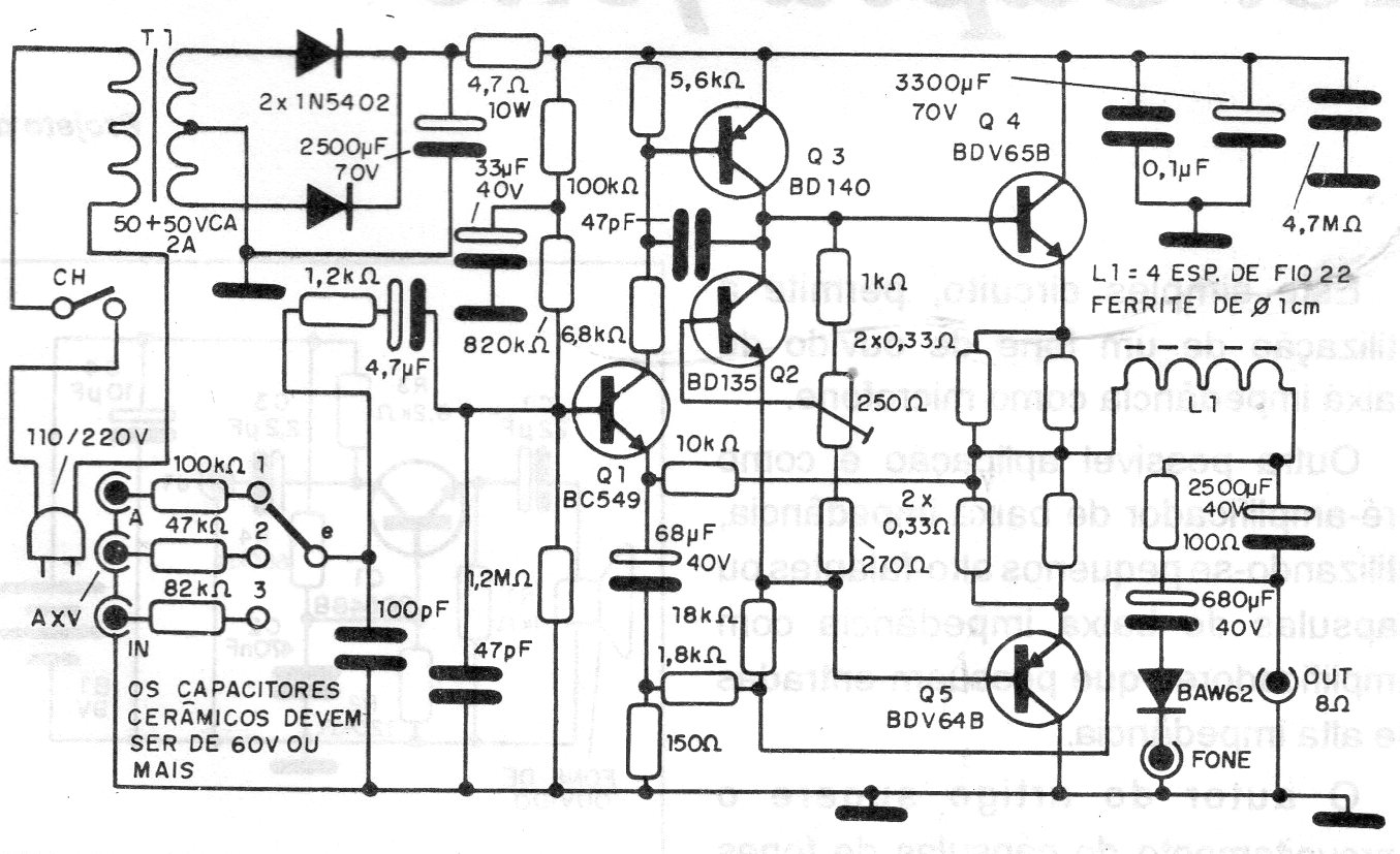 This circuit provides 70 W at 8 ohms and 100 W at 4 ohms. We found this amplifier in a 1992 documentation. The utmost care must be taken with the design of the board, which must have wide tracks for the high current lines. The output transistors must be equipped with excellent heat sinks.