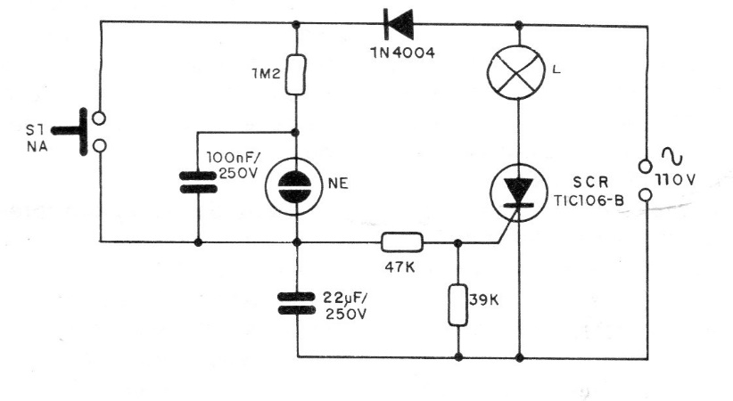 This circuit is from 1990 documentation. When we press D1 the lamp remains on for a time interval that depends on the larger capacitor. Off, the circuit works like a flash with the neon lamp flashing at a frequency that depends on the smaller capacitor.