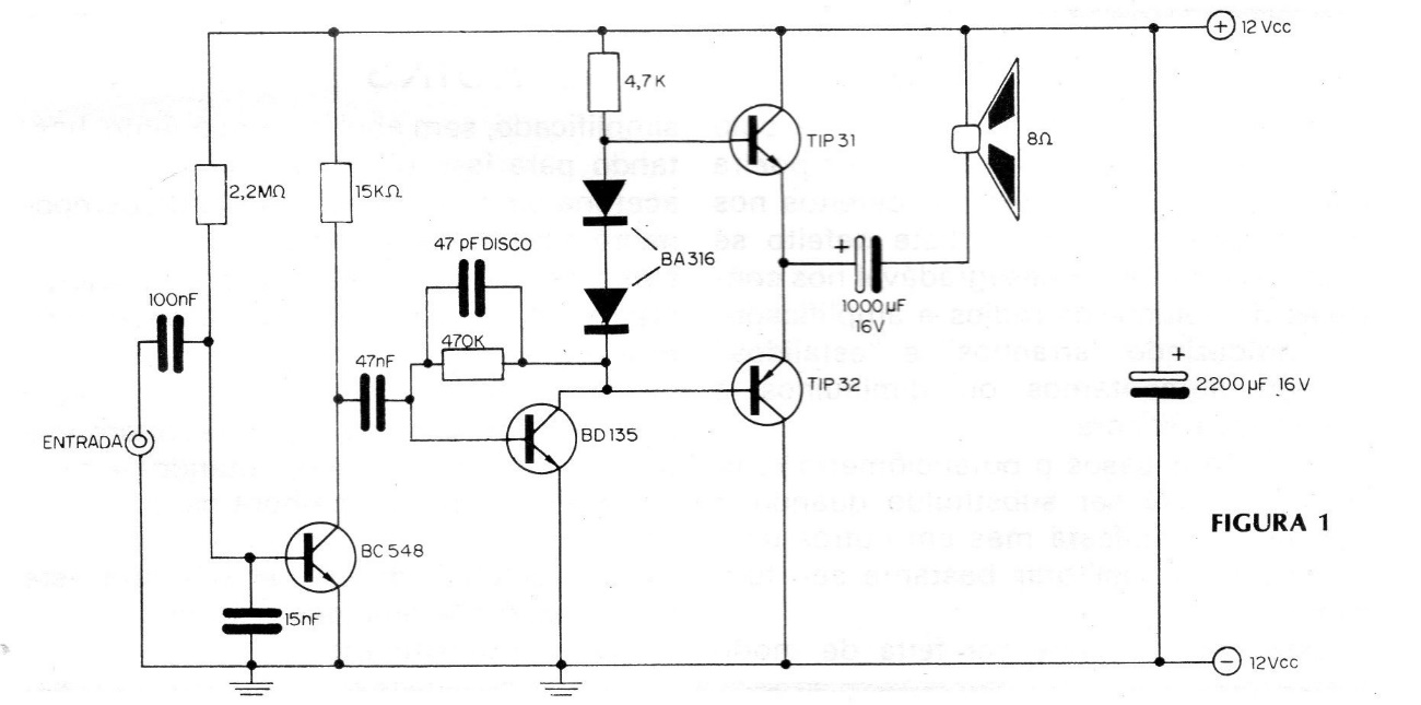 This amplifier, found in a 1981 publication, provides 15 W lHF power with a supply voltage of 14.4 V which means that it will work perfectly when powered by your car's 12 V battery. Two identical units form an excellent amplifier set for the car. The circuit admits a load of 8 ohms at its output and, according to the author, the maximum current required by the circuit (full power) is 4 amps. In the figure we have the complete circuit of the amplifier, with the values of all components. The output transistors, which are complementary to TIP31 and TIP32, must be mounted in a good heat exchanger.