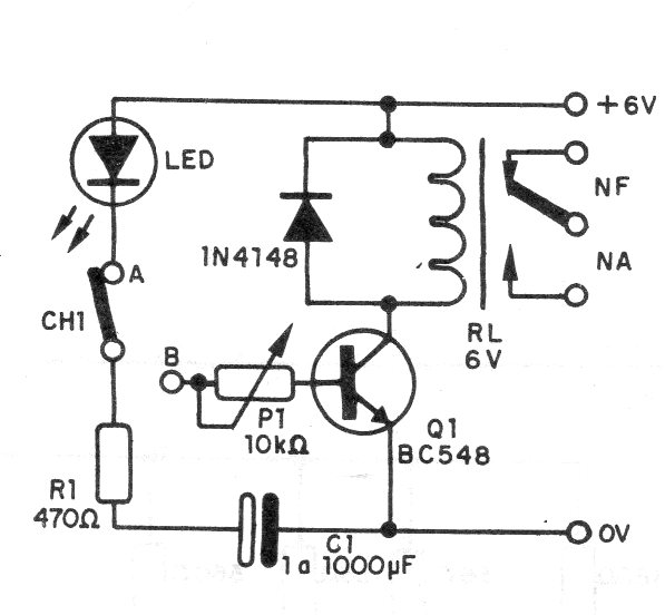 In this circuit, the capacitor is charged with the switch in position A. When we switch the switch to position B, the capacitor is discharged by the transistor keeping the relay activated for a time that depends on the capacitor value. Capacitors from 1 to 1 000 uF can be used for times up to a few minutes.