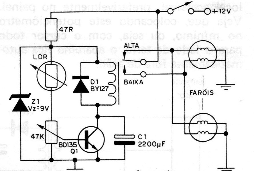 We have here a very interesting project found in a 1982 publication. By the operation of the circuit, readers will be able to easily understand its usefulness. A car comes in the opposite direction to yours, and you have the light high. The car in the opposite direction signals you, asking to turn off the light. You are required to activate the light shift control. On an extended trip, the number of times this operation must be done is something that must be considered, as it becomes unpleasant after a certain time. With the control suggested by the author of this project, the change from high to low light is done automatically with the action of the car light coming in the opposite direction. The complete circuit is shown in the figure and has an LDR as its basic element. This LDR is placed in an opaque tube aimed at the front of the car to receive the light from the vehicle headlight that comes in the opposite direction, as shown in the additional figure. A sensitivity control makes it possible to obtain the ideal trigger point for the circuit. With the action of light on the LDR, a higher base current appears on the transistor, resulting in action on the relay that closes its contacts. In this action we have the switching of the light. The relay remains closed for as long as the light from the car headlight in the opposite direction acts on the LDR a little more, determined by the capacitor of 2 200 uF in parallel with the transistor. Important in this circuit is that when it is out of action, the normal operation of the high and low light car system remains. The transistor can be of any NPN type for general use! medium power such as BCS48, BC547 or TlP29. A 9 V zener placed in parallel with the supply keeps the circuit voltage constant, improving its stability. The electrolytic is 220 or F or 1 500 uF with a working voltage of 16 or 25 V. The sensitivity adjustment is made in a 47k potentiometer which should be in an accessible location, preferably on the panel. Note that by placing this potentiometer at a minimum, that is, with the cursor all the way to the earth side, the device is automatically out of action.