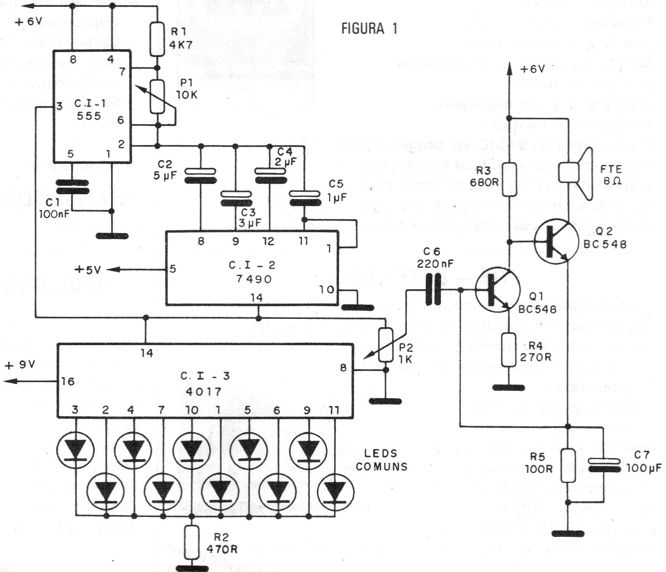 This sound effect circuit was found in a 1987 publication. It is a circuit that drives a set of sequential LEDs and, at the same time, emits sound. The 6 V power supply can be obtained from batteries or a source. Potentiometer P1 controls the speed of the effect and potentiometer P2 the emitted sound.
