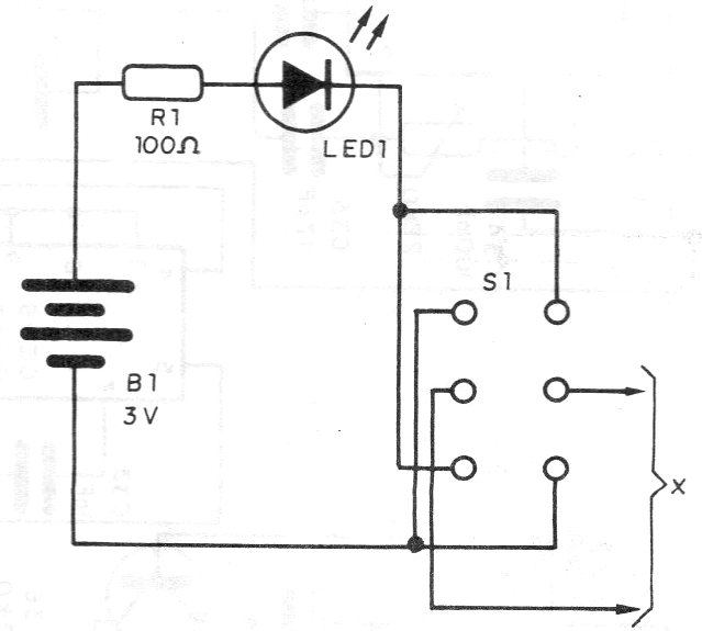 The circuit shown consists of a simple tester for general purpose silicon or germanium diodes and rectifiers. The test voltage can come from 2 or 4 batteries and the indication is given by an LED.