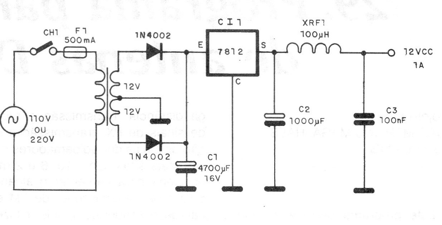 This circuit is indicated for the supply of small and medium FM transmitters that require 12 V under current up to 1 A. The integrated circuit must be equipped with a heat sink. The transformer has 1 A. secondary.
