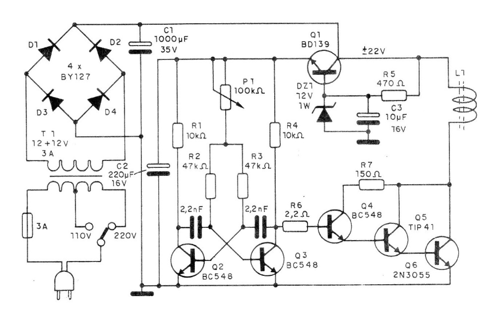 Horizontal output or flyback transformers are no longer used today, as they only appeared on equipment with kinescopes to generate high voltage. However, if the reader wants to try one for an experimental high voltage assembly, he can use this circuit found in a 1992 documentation. The coil must be connected with 5 or 6 turns on the exposed part of the core. When the circuit is activated, there must be the production of high voltage. The 2N3055 must have a heat sink.
