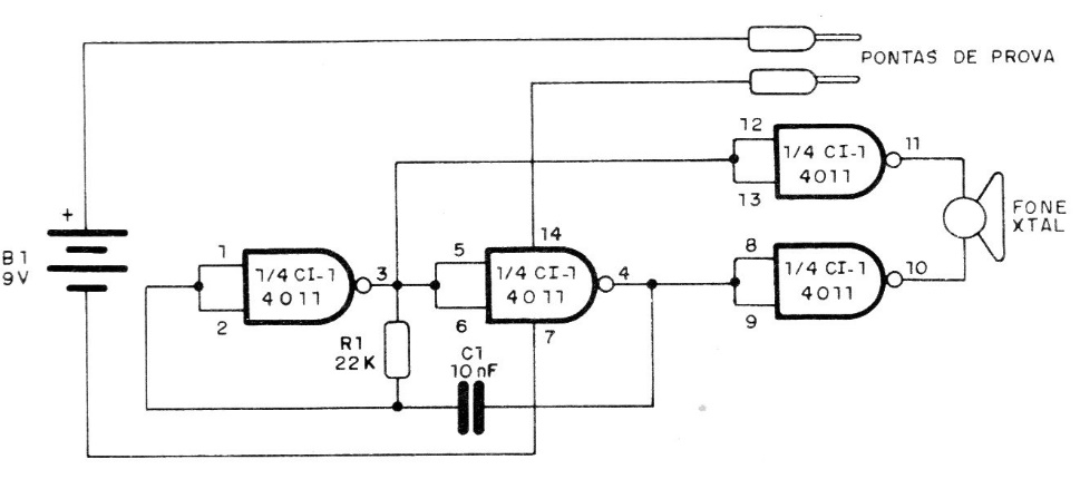 This circuit found in a 1988 documentation, uses a piezoelectric or crystal capsule as a transducer. The power, in fact, can be done with voltages of 3 to 9 V and the frequency of the produced tone depends on the capacitor. This component can be changed in a large band of values.