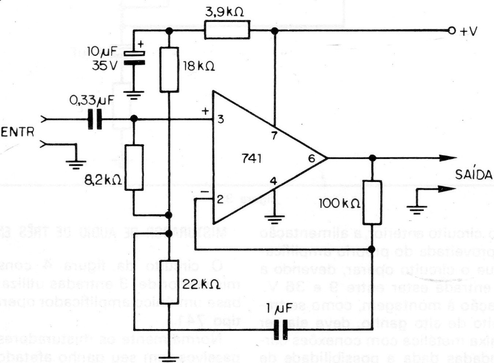 This version of the preamplifier is one of many that the reader will find on this website using the 741. This circuit was found in a 1977 documentation and does not need a symmetrical source. The supply can be made with voltages from 9 to 15 V and the signal cables must be shielded.