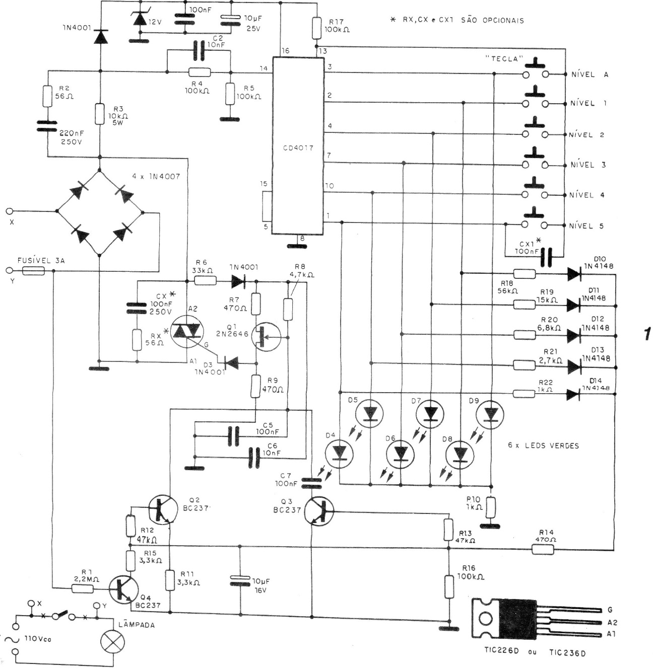 We found this dimmer in a 1994 publication. We can control the speed of an engine through the selection made by pressure switches in a pulsating system. The bridge diodes must be in accordance with the load current and in this circuit, in fact, by the presence of the bridge an SCR could be used, which the author of the project at the time did not consider. The triac (or SCR) must have a heatsink.