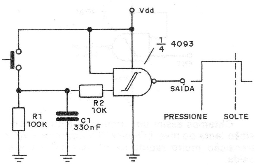 The circuit in figure 12 is ideal for interfaces for microcomputers or digital circuits subject to Contact noise problems. When pressing S1, a perfectly rectangular pulse of duration determined by C1 is produced. The duration of the pulse does not depend on the duration by pressing of S, it should only be shorter, as shown by the output curve. C1 can therefore be changed depending on the desired duration for the output pulse.