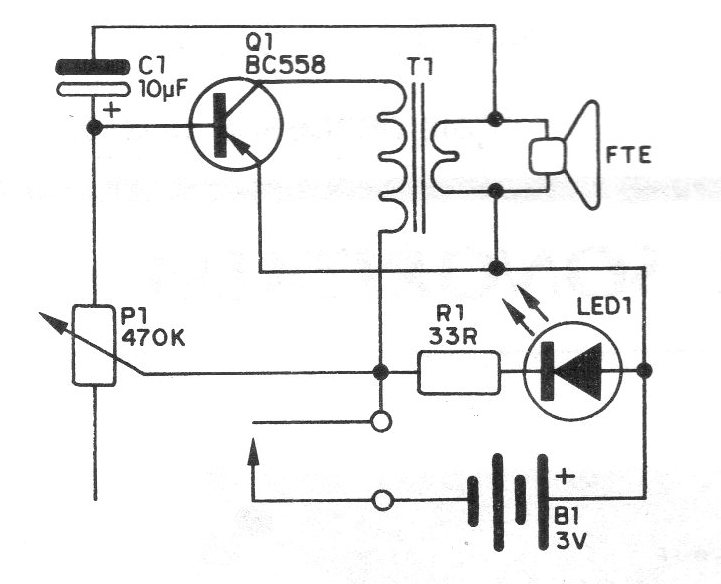 This oscillator for the practice of telegraphy provides a good sound in a loudspeaker, with only one transistor and still uses an LED for visual indication. The complete circuit is shown in the figure. It is a blocking oscillator, whose operation is as follows: when closing the manipulator, Q1 conducts. With the increase of the current in the primary of the transformer, a voltage appears in the secondary, which charges C1 (negatively in relation to the transformer and positively in relation to the base of Q1), resulting in an inverse polarization in the base of the transistor. This reverse polarization makes me stop driving. After C1 is discharged through P1, transistor Q1 conducts again, repeating the cycle. The speed at which the cycle occurs is given by P1 and C1, which then determines the frequency of the sound produced. The components are all common. The T1 transformer is the type used in valve output. For Q1, general purpose transistors PNP or NPN can be used, with the polarity inversion of the power supply. When assembling, the polarity of the electrolytic capacitor, the position of the transistor, the polarity of the LED and the power supply must be observed, which is formed by 2 common batteries.