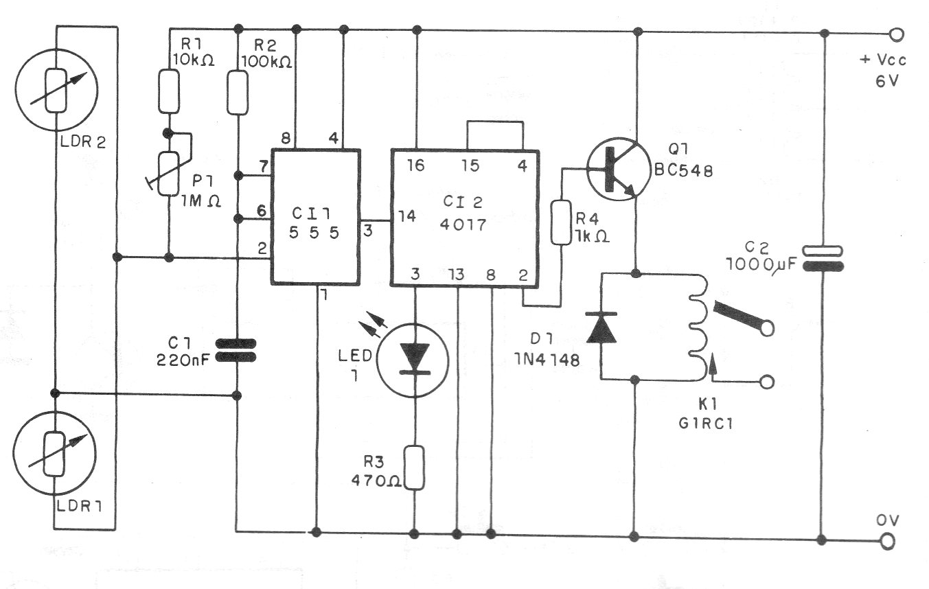 This circuit was found in a 1994 documentation and can be used in several types of automatisms and controls, such as doors. There are two sensors, and the circuit is activated when the light is cut off in one of the LDRs. In the passage of the object, when the light of the other sensor is cut off, the circuit is tripped, that is, its action is bistable. The supply can be made with 6 or 12 V depending on the voltage of the relay used.