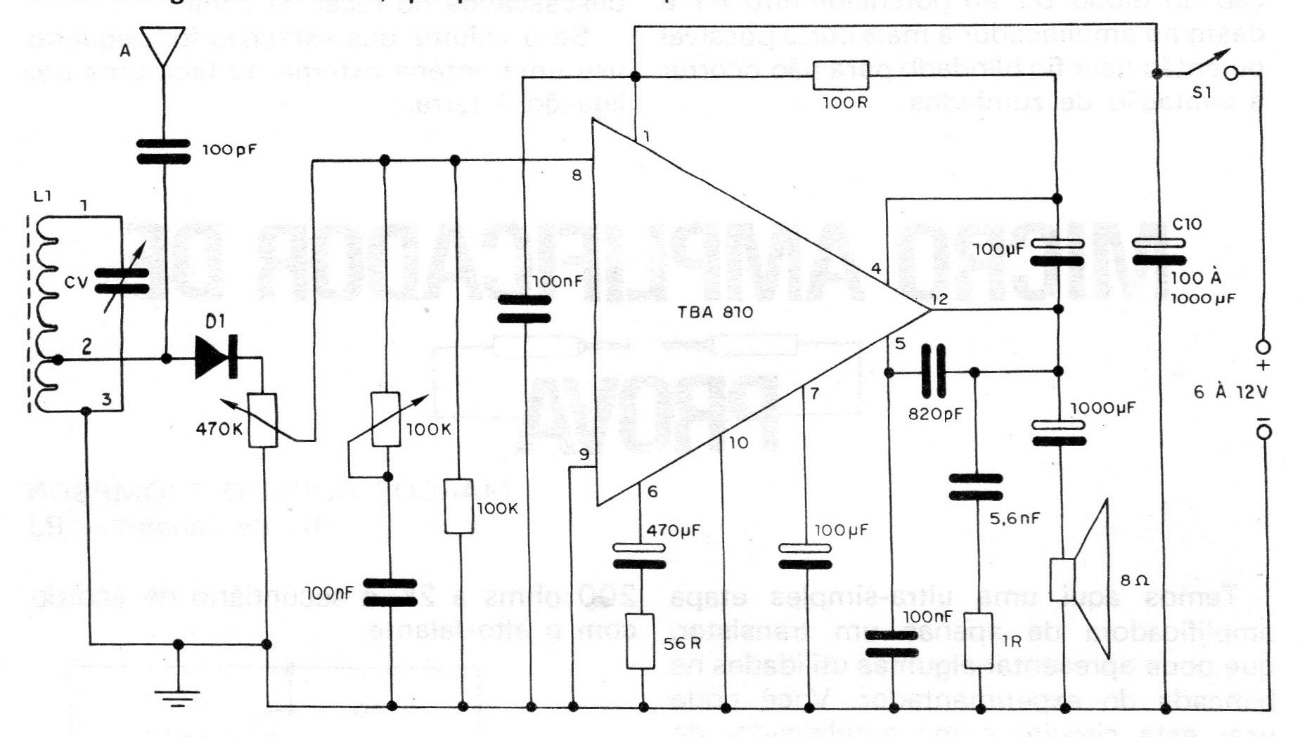 An audio amplifier of good power, and great sensitivity; a simple tuning step and a detecting step, allow to obtain an excellent medium wave radio for local stations. This project is from a 1982 documentation. The selectivity is relatively good for listening to local stations and the sensitivity allows the use of only a piece of wire to capture the strongest stations. The base of the circuit is the TBA810 integrated audio amplifier, which can work with either 6 or 12 V power, depending on its power. This means that we can either make a radio powered by 4 batteries or use it with a 6 to 12 V source. The current of the source in the case of 12 V must be at least 1A.