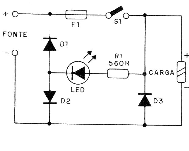 This simple circuit indicates if the polarity of a load is reversed when it is connected to a power source. The circuit also has a protection fuse, and the diodes can be 1N4002 or 1N4004 for any current since the current that circulates through them is only that of the LED.