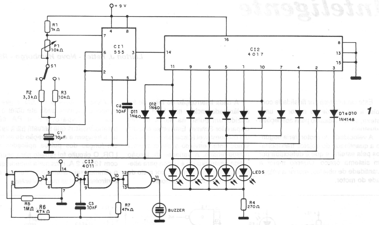 We found this circuit in a994 documentation. It has a visual and a time signature indicator in circuits that trigger loudspeakers and LEDs. The circuit can be powered by voltages from 6 to 9 V and the adjustment of the compass is done through a potentiometer.