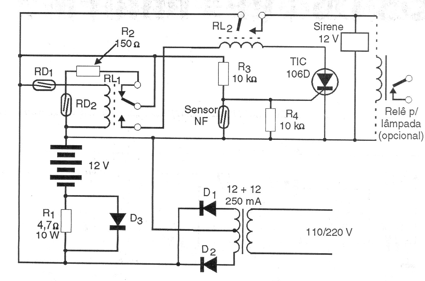 This alarm does not interrupt its operation when the power is cut. A battery is kept at a constant charge, going into action when the power is cut. The circuit can have many NC sensors connected in series and the relay is horny according to the transformer and battery used. The circuit was found in a 1997 documentation.