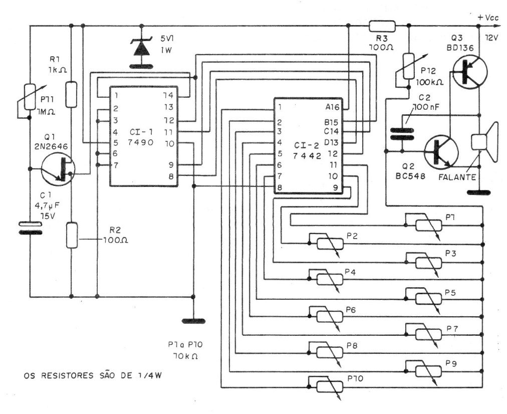 This experimental TTL circuit is from 1992 documentation. It produces programmed sounds set in the 10 k potentiometers. These components control an oscillator with two transistors whose basic frequency depends on the capacitor. The unijunction transistor generates the drive sequence. The supply must be made with 5 V.