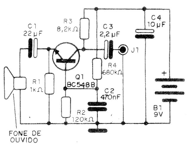 This circuit makes it possible to use a low impedance headset as a microphone. The circuit, on a common basis, has a higher output impedance, matching the input of most amplifiers. The circuit can be powered by 4 batteries or 9 V battery.