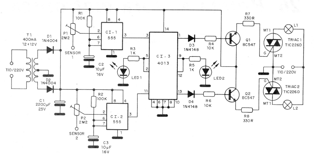 The purpose of this circuit found in a 1990 documentation is to control two incandescent lamps or several lamps using bistable touch sensors. The original circuit requires additional protection through a 470k resistor in series with the sensors. The triacs must be equipped with heat sinks and the trimpots adjust the sensitivity.