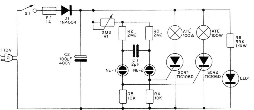 The flasher we present was found in a 1982 publication, shown in the figure. What we have is a multivibrator that uses two neon lamps as basic elements, which activate two SCRs of the TIC106D type. The blinking frequency is determined by the value of capacitor C1, which can have capacitances between 22 nF and 2 uF. This capacitor is of the depolarized, polyester type, with a working voltage of at least 400 V. Each SCR can supply 100 W of lamps, in which case they must be mounted on heat sinks. If lamps less than 40 W in total in each SCR are powered, the SCRs will not need a heat sink. The author informs that, with a capacitance of 2 uF for C1, the flashing period is in the order of 20 seconds.