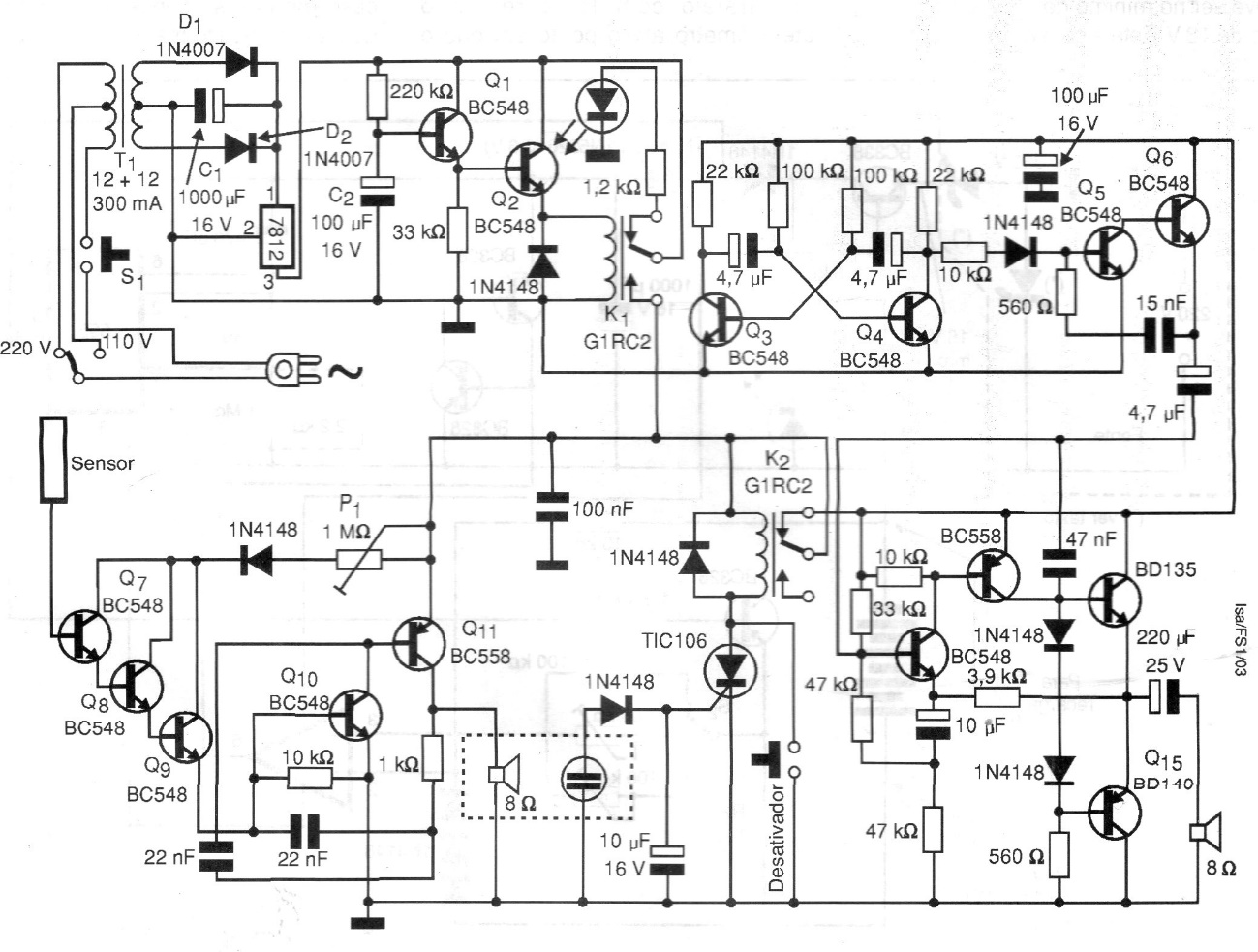 This proximity (capacitive) alarm triggers a relay that, in turn, triggers an audible warning system, was found in a publication in 1998. The circuit includes a source and the wire to the sensor board must not be too long. The audio stage transistors must be provided with heat sinks.
