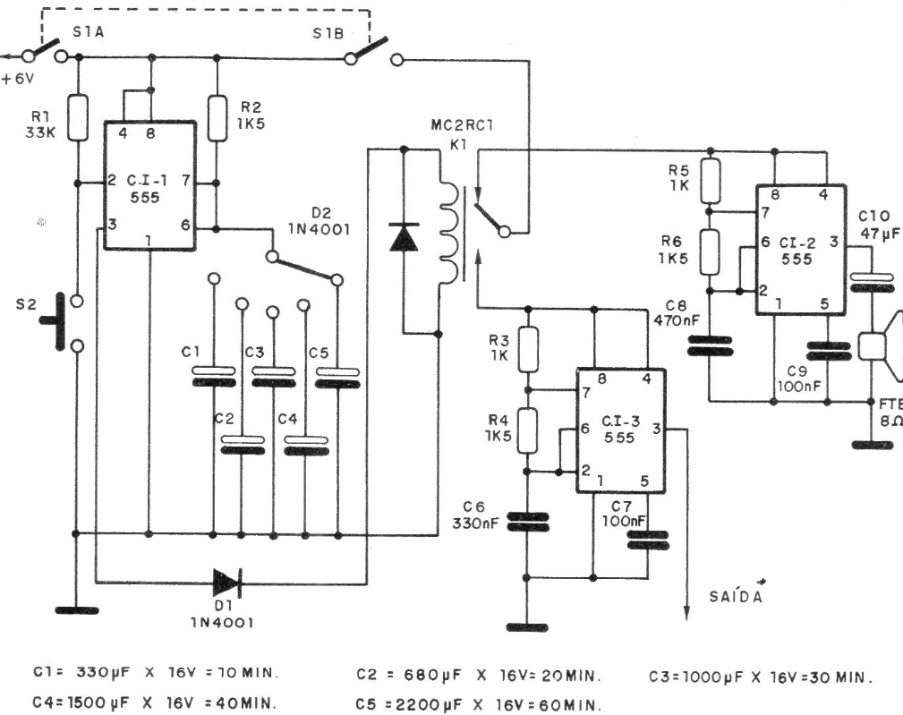 This is a traditional double timer configuration with the 555 found in a 1987 documentation. The circuit uses three 555 integrated circuits. The relays are 6 V, but with their switch to 12 V types and supply with this voltage, the circuit also will work. The timing is selected by a switch that changes the capacitors used.