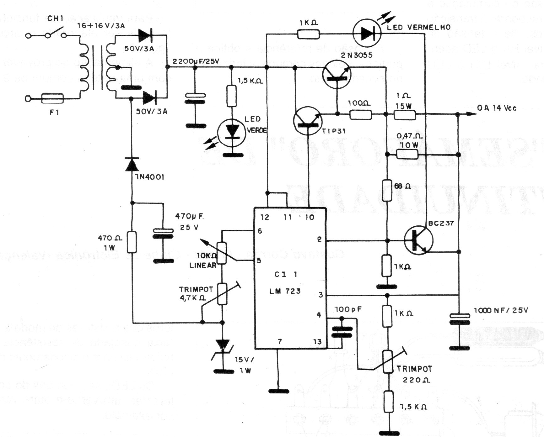 This circuit uses one of the most traditional of the voltage regulating circuits, the 723. This component can still be found, although old, and results in an excellent regulated source as shown in the figure. The 2N3055 transistor must have an excellent heat sink. The power supply has two adjustment trimpots for maximum and minimum voltages.