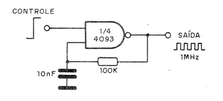 When the control level is increased from 0 to 1 (LO to HI), this circuit is activated, which oscillates at a frequency around 1 MHz. For other frequencies, simply change the capacitor value. The waveform of the output signal is rectangular and the other 4093 gates can be used for other applications.