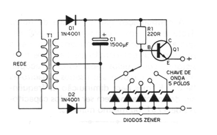 Nothing more useful on the bench than a variable voltage source. This is the source we found in the 1983 documentation. We have a variable source in which several zener diodes are used. Selectable through a 1 pole x 5 position switch. Each diode corresponds to a voltage that the reader wants at the output, depending on the type of work to be performed. The chosen transformer must have voltage according to the maximum desired at the output. For a voltage of 9 V a 9-0-9V transformer is used with a current of up to 1A, and for a maximum voltage of 12V, a 12-0-12V transformer with an equal current. The transistor can be any of the following types: BD135, BD137, BD139, TIP31, TIP41 or 2N3055. This component must be mounted on a heat sink. It is important to note that the zener diode must have a voltage approximately 0.6 V greater than the desired value at the output, since there is a drop of this order in the transistor. To avoid humming in the powered audio devices, the filtering must be good, recommending an electrolytic capacitor of at least 1500 uF.