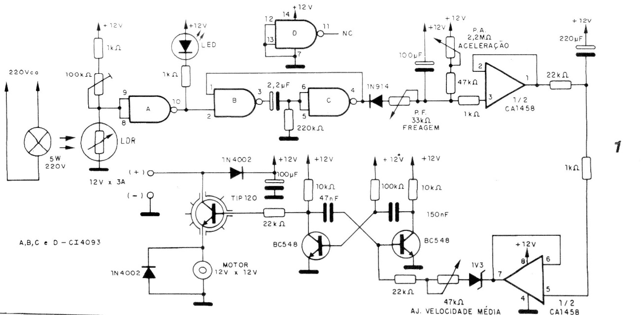 This Industrial Track or overhead crane slows down when it detects more objects. The circuit has a sensor with the sensitivity adjusted in a trimpot and the motor with reduction gearbox is controlled by a transistor. The project can be coupled to a microcontroller for more sophisticated performance and was found in a 1994 documentation.