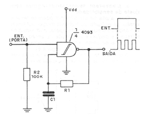 In this application, the astable multivibrator comes into action only in the presence of an input signal. With the HI level at the input, the oscillator kicks in producing a rectangular output signal. As in the previous case, the frequency limits are determined by the characteristics of the 4093 itself and by the external components, specifically the presence of leaks in C. The frequency can be calculated with approximation by the inverse of the RC product. The circuit can be used as a shield for microcontrollers.