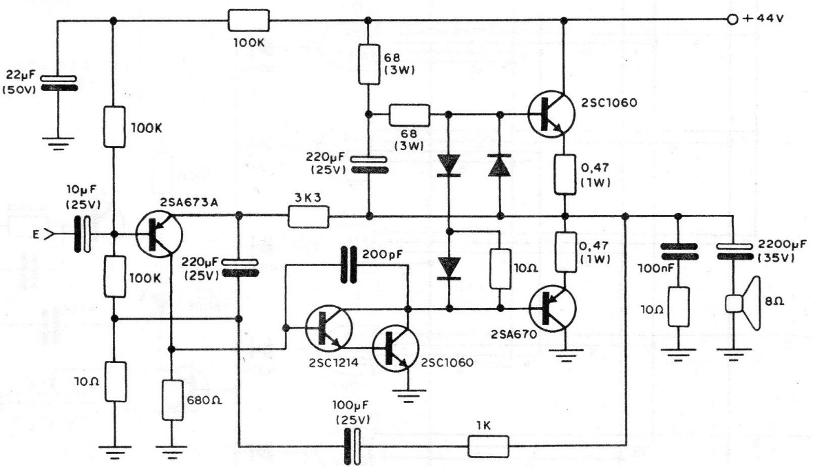 This stage of audio power is suggested by the Hitachi Semiconductor Manual, using a complementary pair at the output. The circuit provides a power of 20 W (RMS) under load of 8 ohms with a supply of 44 V. In the difficulty in obtaining original transistors, equivalents can be tried, namely: For the 2SC1060, the TIP41 can be used. For the 2SA670, the TIP42 can be used. For the 2SC1214 try the BCS47