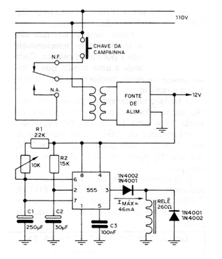 The circuit found in a 1983 publication is shown in the figure. Taking advantage of the capacitor's characteristic of not allowing sudden variations in voltage between its terminals, when the bell is touched, point 2 is connected to earth and the timer goes off. At this moment, the relay NO contact is activated, and the circuit will work, even after the switch is released. When point 3 returns to level 0, the entire circuit is deactivated, ready for a new cycle. The 12 V power supply can control an electronic bell instead of the conventional one. Important in this circuit is that the R2 / C2 branch must have a time constant greater than the voltage rise of the source, that is, when the source reaches 12 V, pin 2 must have less than 4 V (this occurs in a time approximately 1.8 seconds, which is more than enough). In the interval from one melody to another (musical bell), or waiting, capacitor C2 must discharge itself, and this occurs through the internal circuit of the 555 (in approximately 3.5 seconds). If you want to change this time, a 680 R x 1 / 2W resistor is placed in parallel with the source, when the time will drop to approximately 1.4 s. The R2 x C2 value cannot be greater than the timer active time.