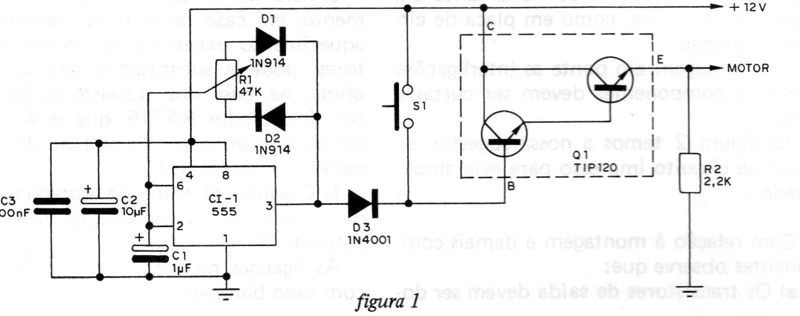 This control, from a 1982 documentation, uses an integrated circuit and a Darlington transistor, as shown in the figure. The operation of the circuit is as follows: the basis of the control is a pulse generator, in which the resistor R1 controls its duration and separation. As we can see, both the charge and discharge of capacitor C1 are controlled by R1. Diodes D1 and D2 also control this charge and discharge. Thus, when the cursor of R1 is in the central position, the charge of C1 will be equal to its discharge. However, when the cursor of R1 is on the side of D1, capacitor C1 discharges quickly and charges more slowly. The reverse situation occurs when the cursor of R1 is on the side of D2. The discharge is slower and the loading faster. The pulses present on pin 3 of Cl1 are amplified by transistor Q1, and then applied to the car's engine. If the pulses have a short duration and a large spacing, the speed will be small, and if they have a long duration and a small spacing, the speed will be greater. In case of quick start, S1 is normally used.