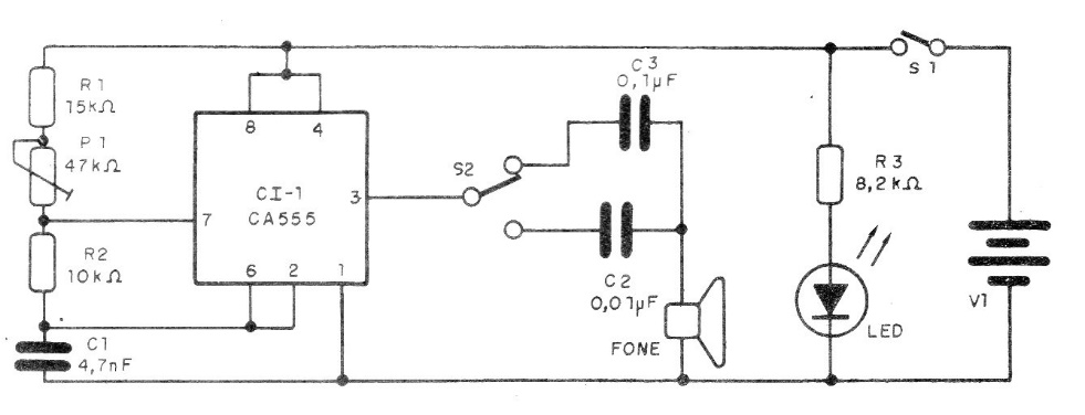 This simple oscillator is yet another of the many versions of sonic insect repellent that we find on this site. The circuit is powered by voltages of 6 to 12 V of batteries and the transducer is a low impedance headset, although piezoelectric capsules or even a small speaker can also be used.