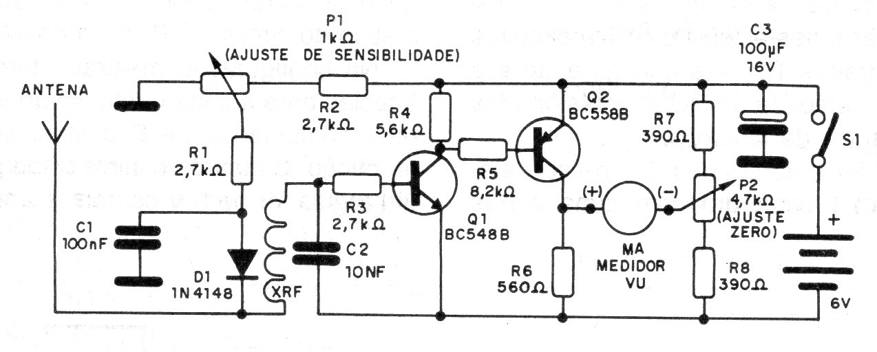 We found this circuit in a 1995 documentation. It can measure frequencies from 100 kHz to over 100 MHz without the need for tuning. The sensitivity is good thanks to an amplification step and the trimpots adjust the gain and scale limit of the indicator instrument. Power is provided by batteries and the instrument is 100 uA to 1 mA full-scale.