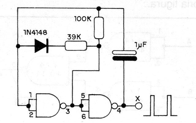 The circuit shown in the figure uses 2 of the 4 NAND gates of a 4011 and is designed to produce short duration pulses. The pulse duration is given by the diode and the resistor in series which can be changed as needed. The frequency of the oscillator is given by capacitor C and the 100k resistor. The frequency can be modified by changing the capacitor value. The relationship between the two resistors gives us an approximation between the duration and the pulse interval. The maximum recommended operating frequency for this oscillator is around 1 MHz. The minimum frequency depends only on the presence of leaks in the capacitor.