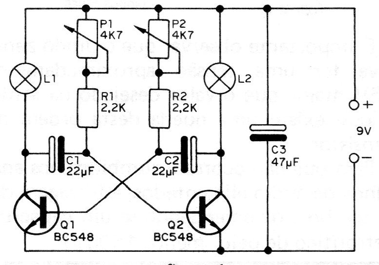 This flasher of two incandescent lamps was discovered in a 1983 documentation and it has two frequency controls. The configuration is nothing new. It is an astable multivibrator in which the frequency is determined by both the base polarization resistors of the transistors and the coupling capacitors. Capacitors of 22 uF are used in the circuit, but to reduce the frequency of blinking, capacitors of 47uF or even larger can be used. By changing the value of the base resistances, the lighting time of each lamp can be modified significantly and, therefore, the operating frequency of the circuit. This change is made by two independent controls, connected at the base of each transistor. These are potentiometers, whose values can be between 4k7 and 22 k. The transistors used are of the BC548 type that withstand currents up to 100 mA, a current that must be the maximum of the lamps used. Equivalents such as BC237, BC238 or BC547, can be perfectly used. The supply between 3 and 9 V depends on the lamps.