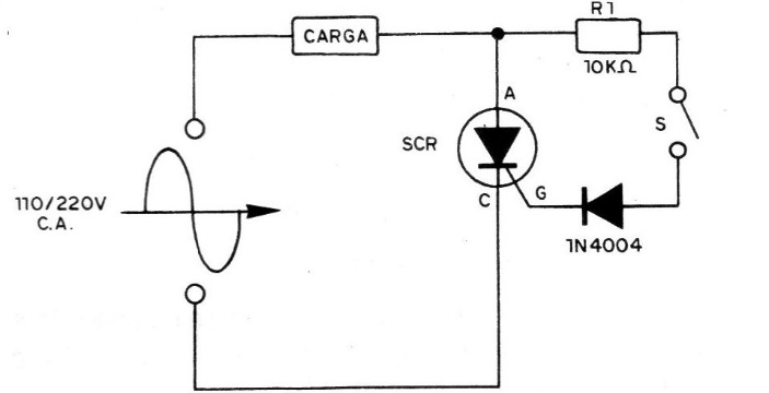 This circuit shows how to control a power load using a low current switch. The circuit is half wave and the maximum current controlled depends on the SCR. The SCR must have a heat sink. SCRs of the TIC series can be used with voltage according to the supply network.