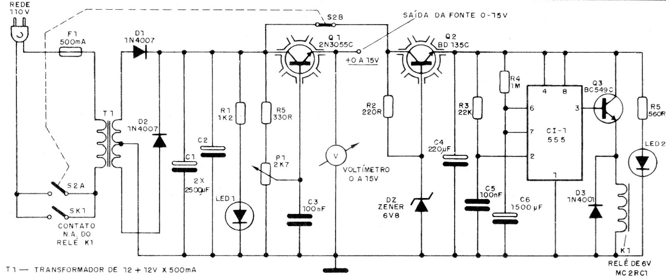 This source circuit, published in 1988, incorporates a timer with integrated circuit 555. In this way, the activation time of the source must be programmed by the resistor and capacitor next to pins 6 and 7 of 555. A potentiometer can be predicted for time adjustment. The maximum current of the source is 500 mA and the voltage adjustable between 0 and 15 V.