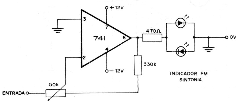 This circuit is based on an operational amplifier that is no longer common today but can be designed with equivalent operating systems. The circuit is from an old publication and is connected to the circuit discriminator. When tuning in to a station, the circuit indicates when the green LED lights up.