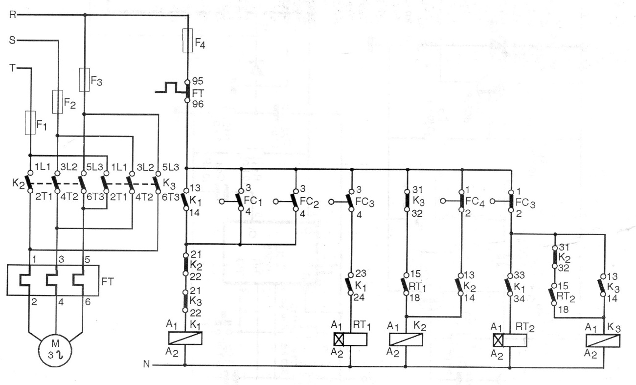 We found this control circuit for three-phase motors used in the control of doors and gates in a technical documentation from 1997. The circuit makes use of contactors and limit switches, in addition to other elements common in electrical applications. In this circuit FC means limit switch and RT timer.