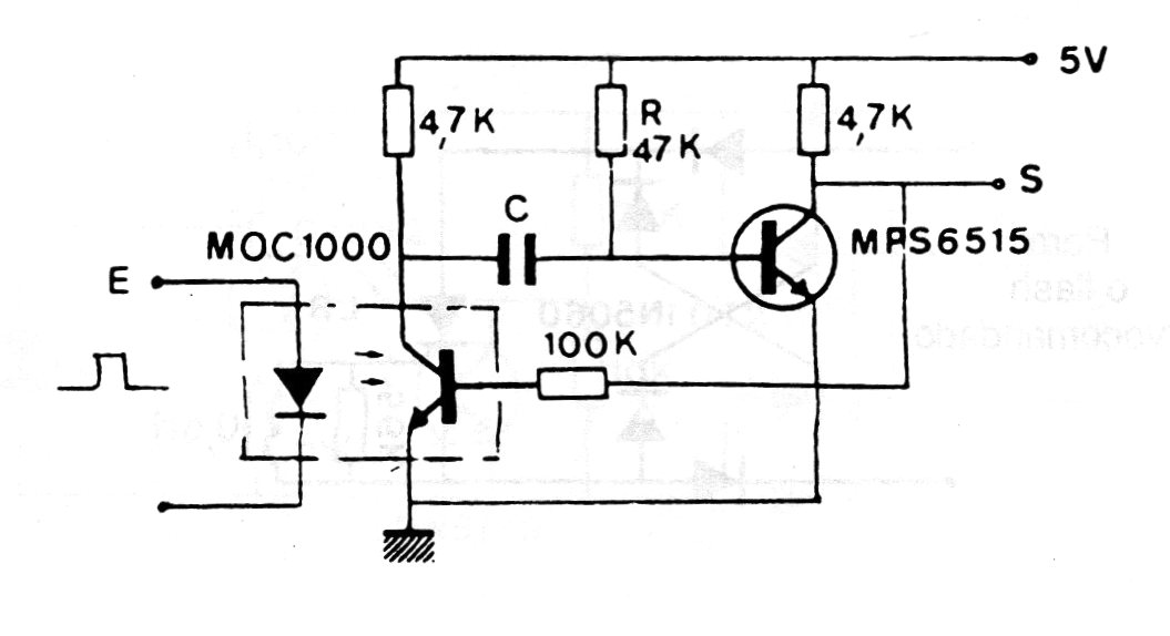 A new monostable optical shield configuration is shown below. The time in which the output signal is present is determined by capacitor C. The optical coupler admits equivalents and when excited by a microcontroller, a 120 to 330 ohms resistor must be provided in series with the output. The circuit is from an old French documentation. The transistor can be 2N2222.