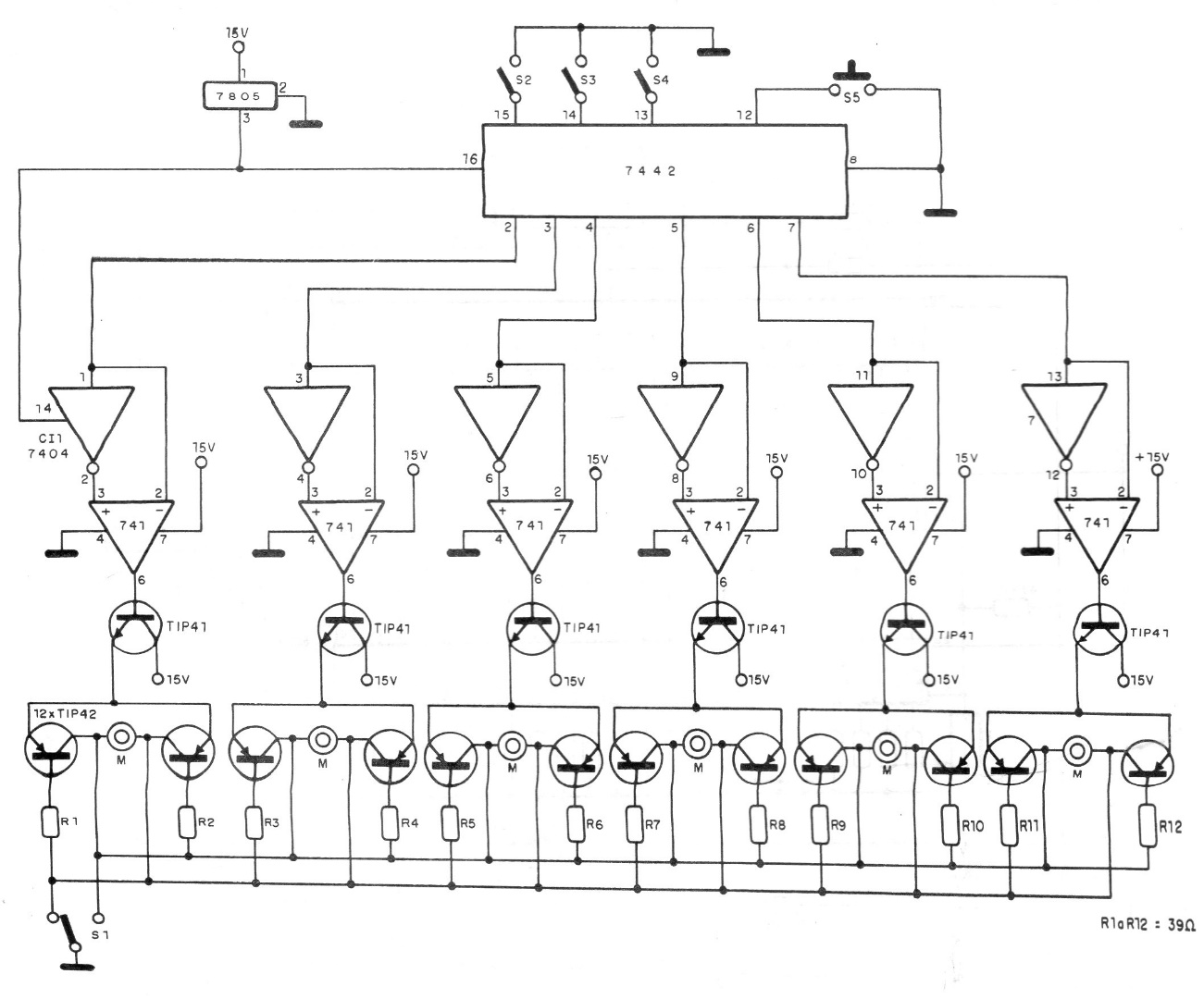 This circuit is from 1994 documentation. It consists of a control for several DC motors that are part of a robotic or mechanical arm. The circuit can also function as a shield being controlled by a microcontroller. The supply voltage is 5 V as the circuit uses TTL components.