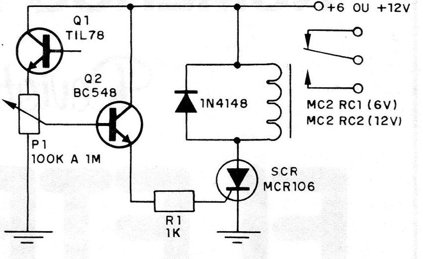 Lockout shooting, due to the incidence of light, can be achieved with the circuit in the figure. In this case, the lighting of the phototransistor causes the transistor to be polarized to conduct the current, which leads the SCR to trip. The SCR activates the relay, which is kept in this condition even after the photosensor current has disappeared. To reset the circuit, the current through the SCR must be interrupted momentarily. This can be done by turning the power off for a moment or short-circuiting the anode and the SCR cathode using a push button.