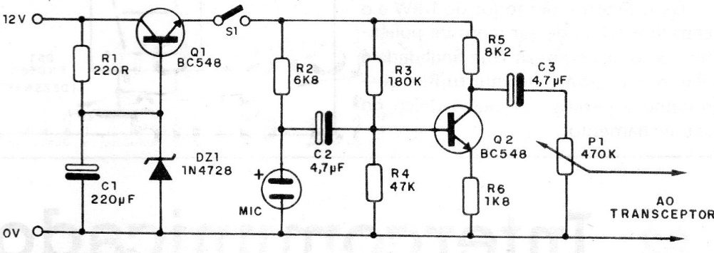 This circuit consists of an electret microphone amplifier powered by a 12 V voltage. A regulator is used to reduce the voltage. Signal cables must be shielded. The circuit can also be powered by a 9 V battery, eliminating the regulation stage.