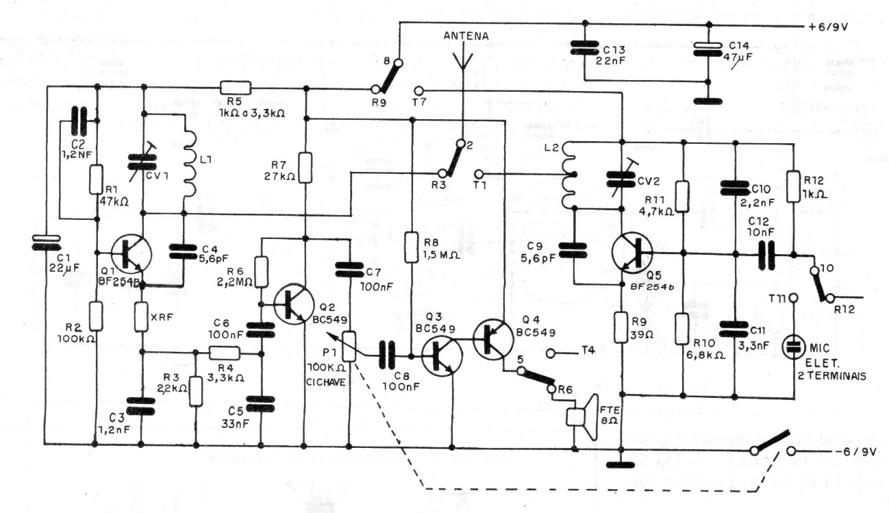 This circuit that uses only common transistors can operate between 60 and 130 MHz, depending on the coils that can be easily changed. The circuit has frequency and reception adjustments made in the trimpots and uses electret microphones. The range can reach more than 100 meters depending on the propagation conditions of the place. The antenna is telescopic with 50 cm to 1 m in length. The supply can be made with 6 or 9 V of batteries or battery.