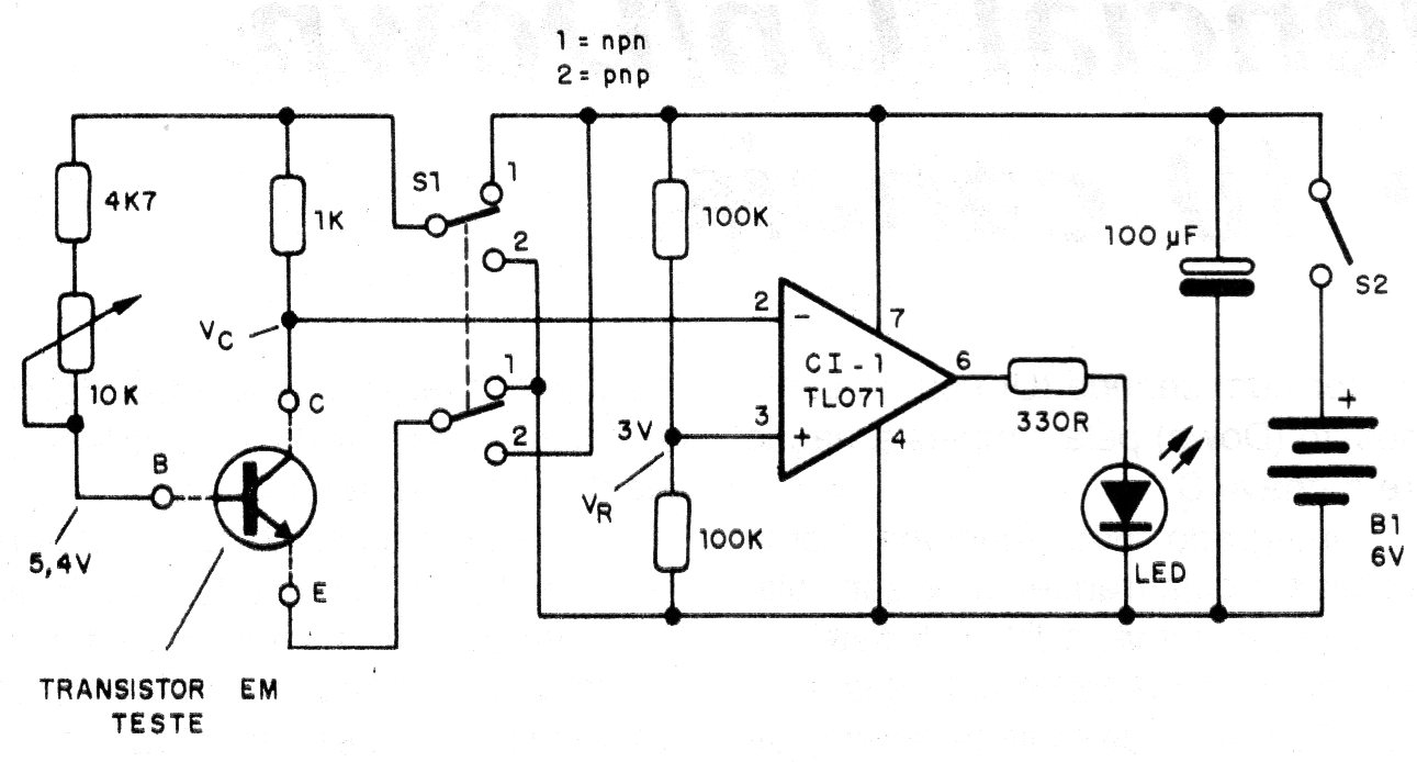 This circuit is from 1990 documentation. It uses a bridge with LEDs and the potentiometer must be calibrated in terms of hFE according to the table. The circuit is powered by 4 batteries and it can be used with transistors for generating, medium and high-power use, in addition to Darlingtons.