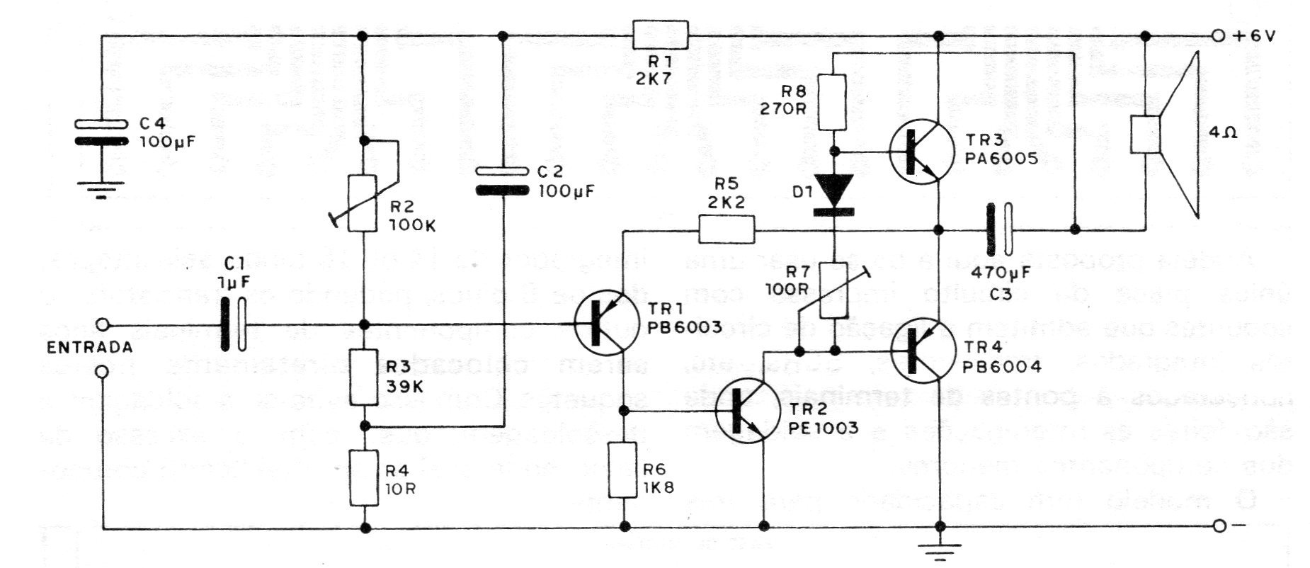A low power amplifier like this can be of much more use than most readers may think. It can be used as an audio stage for experimental AM and VHF receivers, as a sound reinforcer for portable radios, in intercoms and as a test amplifier on the bench. The complementary symmetry configuration guarantees low current consumption and at the same time sensitivity and good reproduction fidelity. The circuit is powered by 6 V, which means the possibility of using ordinary batteries in its source. Only 4 general-purpose transistors are used in a circuit with complementary symmetry output. This output allows the direct connection of a speaker in view of its low impedance.